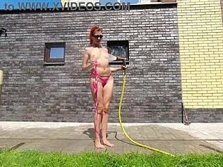 Pink Bikini Babe Hoses Shaved Pussy In Garden