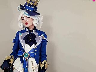 Kinky Furina from Genshin Impact begs for Aether's cum creampie in her shaved pussy over desserts in bedroom cosplay.