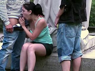 public sex threesome in city with young 18+ cute teen girl