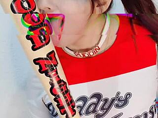 Is Granny Harley Quinn giving a solo blowjob in comic style?