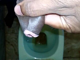 she positions herself over the public toilet bowl and releases a steady stream of pee