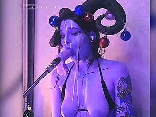 White lingerie girl licks huge tits and sucks toy squirting milk