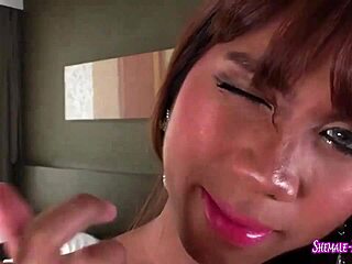 the tgirl prostitute gets her face covered in jizz after an interracial assfucking session in high definition