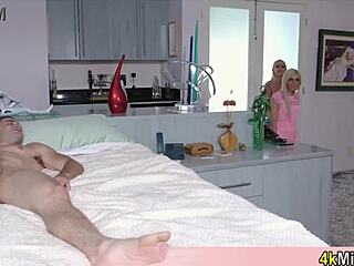 Experience a taboo threeway featuring busty stepmom and teen in glasses